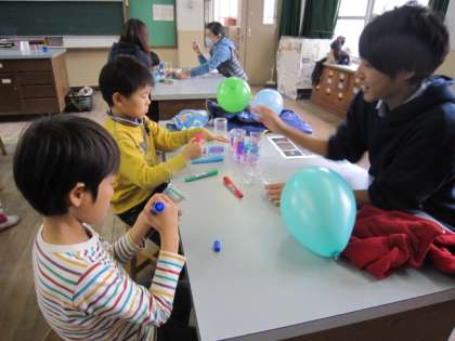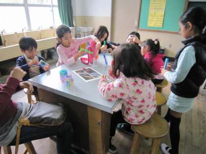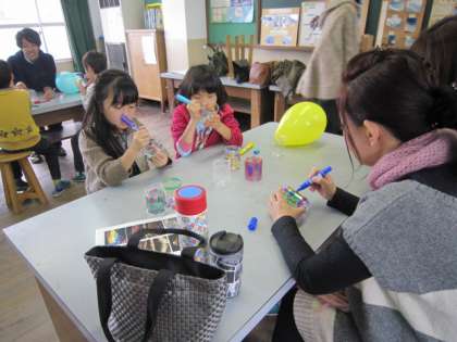 風船バレーの次は、ペットボトルに絵を描いてキャンドルポットをつくりました。