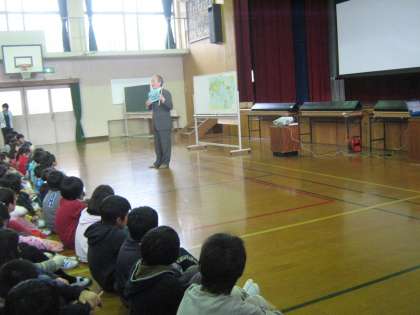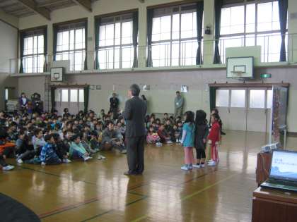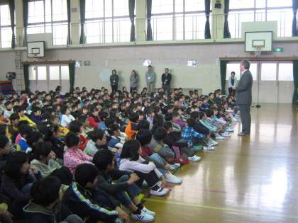 外国からきた友だちの紹介で,校長先生は,「外国から来た友達はどんな友だちが一緒にいてくれたら良いと思うか」と子どもたちに問いかけました。「やさしく接する友だち」「一緒に遊ぶ友だち」という意見を言う子がいました。それを受けて,「この体育館から出るときには,自分がどう行動するかを決めて出ましょう」と話されました。