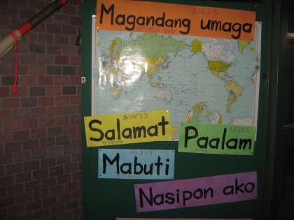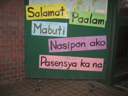 校門から入ってすぐの掲示板にフィリピン語での「おはよう」「ありがとう」「さようなら」「げんきです」「かぜをひいています」「ごめんなさい」があります。覚えて使ってみたいですね。