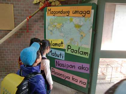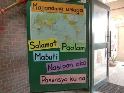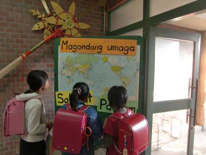 世界地図で日本とフィリピンが分かるようにして,その周りにフィリピンの言葉を張りました。「おはよう」とか「ありがとう」とか「さようなら」とかはフィリピンではこんなふうに言うんだよということを伝えたいと思いました。