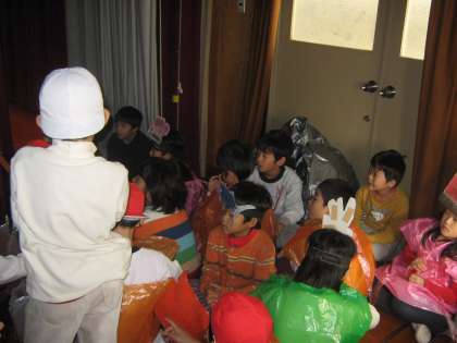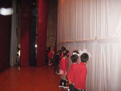 教科書に載っている「スイミー」の話の劇です。1枚目は幕がこれから開くところ。2枚目は舞台のそでで待っている時も,みんなで声を合わせて歌っている所。3枚目は小さな魚が大きな魚を追い払うところです。