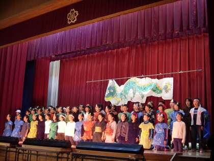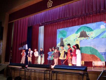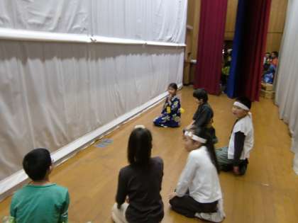 幕が上がるのを待つ桃太郎たち。緊張でガチガチ。