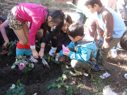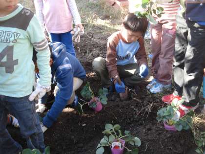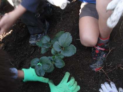 イチゴの実がなるのを楽しみに,みんなで丁寧に植えました。これから大事に育てていきます。