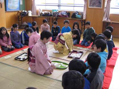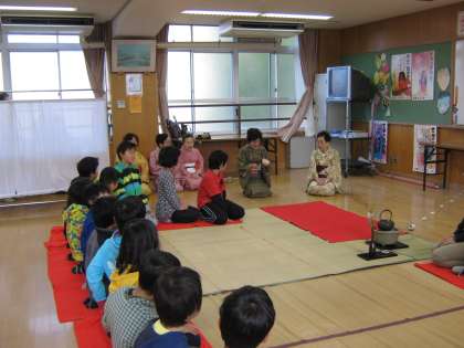 地域の女性会の皆さんのご協力で,3年生と4年生が茶道の体験をしました。日本の伝統文化に触れる貴重な時間です。1時間目と2時間目は3年生が体験させていただきました。