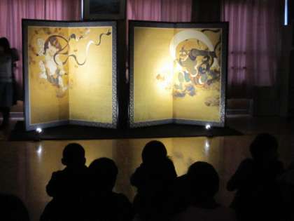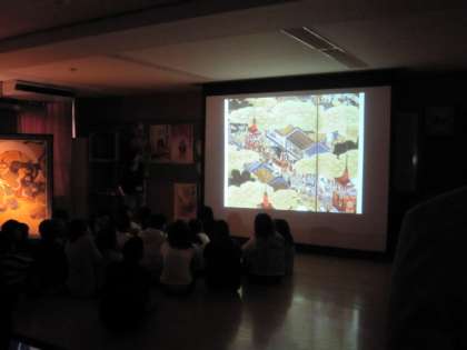 実際の大きさの屏風を目の前に,子どもたちも真剣に学習に取り組んでいました。周りを暗くしてライトを下から照らして映し出された,「風神雷神図」はとても迫力がありました。