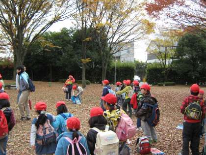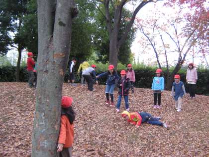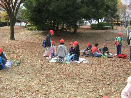 工場見学の後は,中書島の伏見港公園でお弁当を食べました。枯葉が敷き詰められた公園で,愛情たっぷりのお弁当をどの子もおいしそうに食べていました。食後には,「おにごっこ」や「だるまさんがころんだ」などで楽しむ姿がありました。