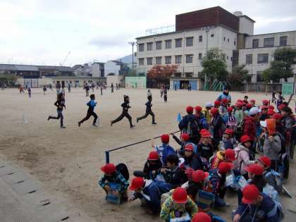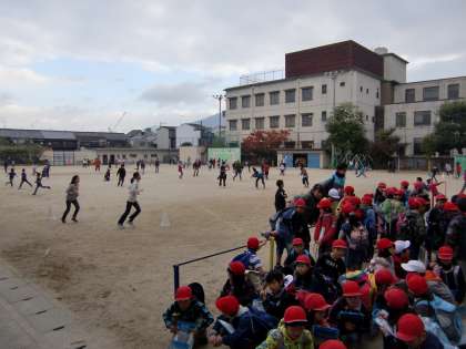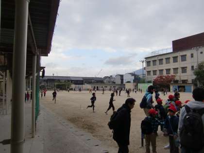 部活の子どもたちが朝ランニングをしている運動場の端っこに集合しているのは3年生です。電車・バスを乗り継いでコーラの工場へ見学に行きます。出発前の様子です。