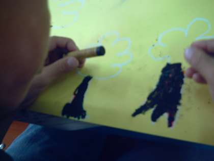 前期最終週に入りました。図工では「みてみて おはなし」の単元に取り組んでいます。2組では「はしれ!カボチャ」というポルトガルの昔話を読み聞かせ,みんなの思いをふくらませているところです。今日は背景の木を夜の森のイメージにあわせて,表現しました。スクラッチという技法を取り入れています。みんな手を真黒にするほどクレパスをぬりこんで,つまようじでおもいおもいの模様を描き込んでいました。今後,完成までがどうなるのか指導者としてもとても楽しみです。