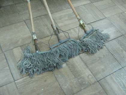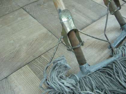 掃除で使っていたモップが年月がたち木の部分が傷んできました。そのためにモップの先の釘が取れてはずれてしまいました。しばらく使われずにいたものを,用務員さんに修理してもらいました。釘の所をネジで固定して,上の部分は針金で巻いてもらいました。大事に使っていきたいと思います。