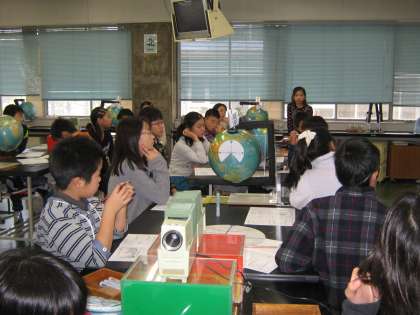 班ごとに地球儀と太陽に見立てた光源を準備し,地球儀に設置したぼうばかりの影の様子を観察します。地球と太陽を宇宙にいるつもりで観察したのでした。