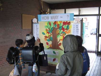 校門入ってすぐの掲示板には,「HOW MANY 〜 ?」の文が貼ってあります。そして,今日から聞いている葉っぱの色が変わっています。もちろん,それに合わせた数も変わっています。葉っぱの色が違うことに気付いて数え始めた児童がいました。