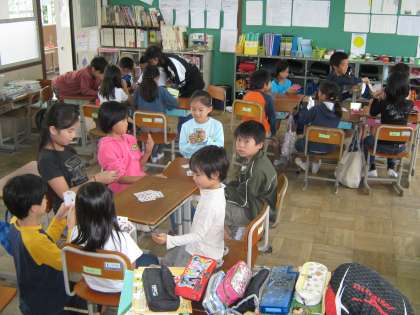 今日の中間休みに,たてわりあそびがありました。あいにくの雨で,運動場が使えませんでしたのですべてのグループが室内遊びでした。トランプやウノ,絵しりとり,パズルまでするグループもありました。