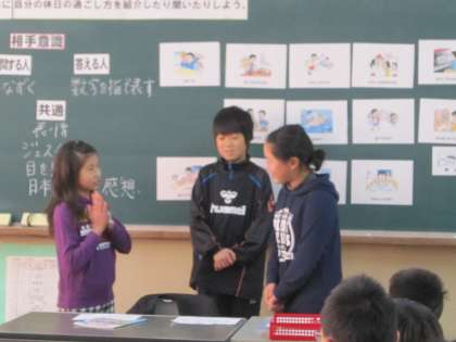今日の6時間目に6年2組で英語活動の授業がありました。自分の休日の過ごし方を英語で相手に伝えます。相手意識を大切にして、言葉だけでなくジェスチャーや表情にも注意をしていました。子どもたちは、コミュニケーションの楽しさを味わいながら、英語を学びました。