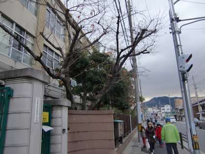 写真下…校門横のサクラの枝から葉がなくなりました。毎日掃いても掃いても追いつかないくらいの落ち葉の量でしたが,いよいよ越冬態勢に入りました。
