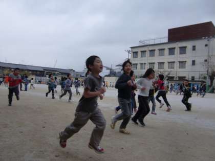 うっすら雪で覆われた運動場の土は凍てついています。今日の朝ランニングはその上でやりました。