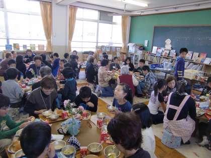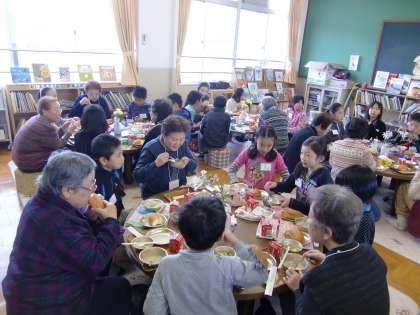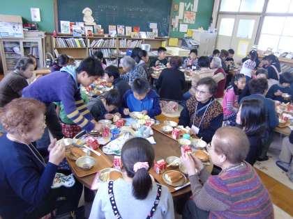 今日のすこやか給食は4年1組です。いつものように,吉田地域の高齢者の方々と楽しく朗らかな昼食会です。