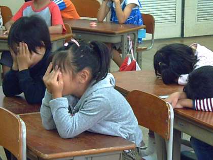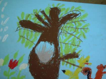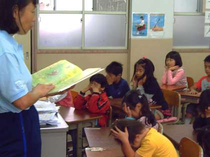 1組は「ファーディのはる」というお話に取り組んでいます。子どもたちは担任の先生から「目をつむって,頭に描いてください」といわれ,教室にはしんとした空気が流れていました。森に春がやってきて,果樹園には白いものがひらひら・・・雪が降ってきたと勘違いしたファーディがとった行動は・・・。春のイメージをふくらませて豊かな色づかいで表現できるといいです。