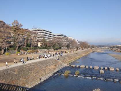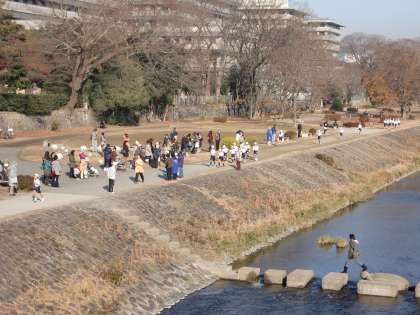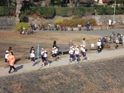 この写真は特に説明することはありません。亀石をピョンピョン飛び越えてらっしゃる保護者の方がいて,子どもたちを先導するかのようにオレンジの服で快調に走る女性がいて…。