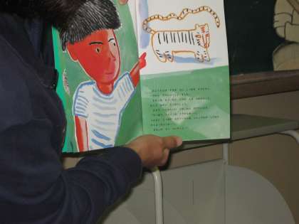 「トラのナガシッポ」は,主人公のお父さんが描いたトラが目の前に現われて,ジャングルに連れて行ってくれたものの,さまざまな動物たちから襲われそうになるという話でした。襲ってくる動物に対するトラの奇想天外な解決策に思わず笑い,話に引き込まれていました