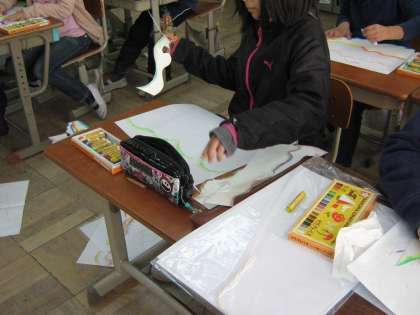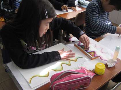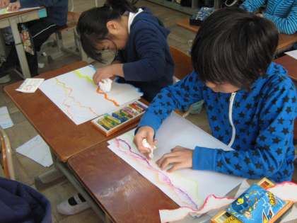 3年生の図工で,版画のバックになる絵を作っていました。バックになる紙の上に曲線の厚紙を置き,縁にパスを塗って上の方にティッシュでこすっていきます。きらめくような波がみんなの机の上に出来上がりました。