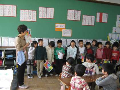 色々な時にお世話になっている2年生に1年生からプレゼントをします。そのプレゼントの基本の色になる所を,2年生に聞いて作ることにしました。今日は教室まで行き,「What color?」と聞く事が出来ました。