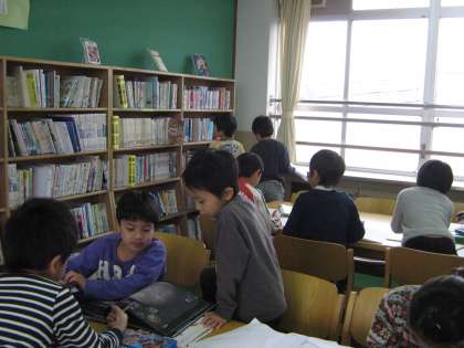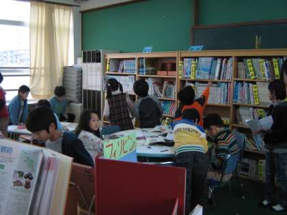 2年生が「図書館探偵団」になって,図書室にやってきました。図書室の本棚の地図を作ったり,本を探す工夫を話し合ったりしました。本が0から9までの番号に種類別になっていることや作者名の五十音で並んでいることに気付きました。