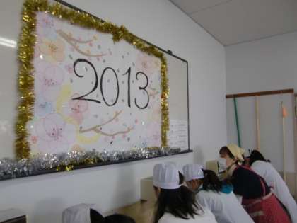 給食室のサービスホールの飾りつけが『正月バージョン』に変わりました。『クリスマスバージョン』に引き続き,今回も3人の給食調理員さんの手作りです。
