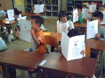 10月9日,今日は前期終業式でした。体育館に全校児童が集まり,校長先生のお話を聞きました。校長先生のお話は「あいさつを自分からしっかりしましょう」ということと,「早起きをしましょう」ということを特に強調されていました。気持ちの良いあいさつはコミュニケーション能力の基本です。1年生はほとんどの児童が元気にあいさつをしていますが,自分からできるともっといいですね。教室で担任から初めての通知票が渡されました。みんな神妙な顔をして受け取りに来ましたが,「なかを見ていいですよ。」というと,ニコニコ笑顔になりました。入学してから今日までたくさんのがんばりがあったことをお家の方と一緒にたくさんお話してくれるとうれしいです。