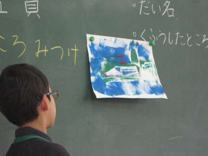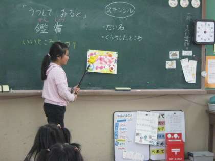 音楽鑑賞は良く聞く言葉ですが,図工でも作品を鑑賞する活動を大事にしています。今日は,2年生が自分たちが作った「うつしてみると」(ステンシルの技法を使って)の単元の作品の工夫したことを発表し,聴いた方はその作品の良いところを探すようにしました。