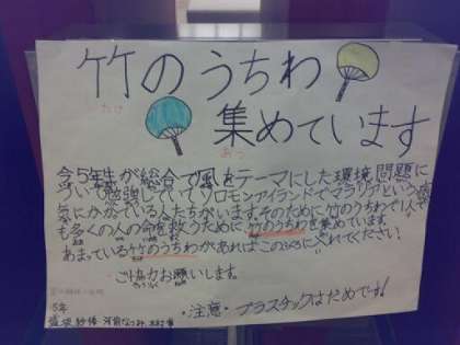 この話をきいた子ども達は,自らポスターを作成し,自分たちが住んでいるマンションに張らせてもらい,竹うちわの寄付を呼びかけました。