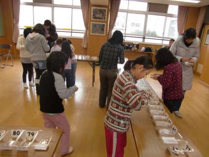 中間休みには,「仕分けをやりたい人,集まれ〜」と校内放送を入れるとたくさんの子が来てくれました。大人と子どもの協働作業です。みんなですることがうれしいし,楽しいのです。