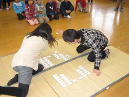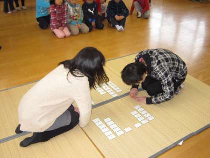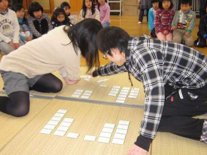 今回のサタデースクールは、「カルタを楽しもう」ということで、カルタ遊びをしました。でも、最初、子どもたちはこわがっていました。というのも、同志社大学のボランティアの学生のみなさんが、競技カルタを子どもたちの目の前で見せてくださったからです。カルタが、すごい速さで飛んでくるのです。