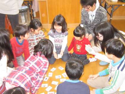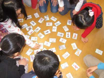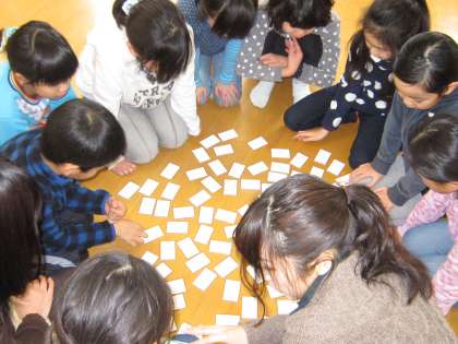 すごい技を見せていただいた後、子どもたちも、いざ、カルタ取り!1・2年生は、「いろはカルタ」で遊びました。「ゐ」や「ゑ」など、初めて見る字も覚えて上手に札をとっていました。3・4年生は、百人一首で遊びました。上の句だけで、札をとる子もいておどろきました。いつかは、カッコよく札を飛ばしてみたと思っているようです。