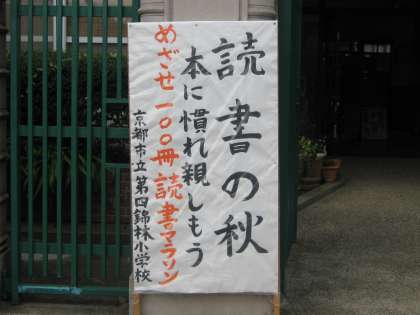 玄関には,「読書の秋」の立て看板を掲げています。「目指せ100冊読書マラソン」に,全市の小学校で取り組んでいます。本校では,低学年では,100冊とは言わず,200冊,300冊を目指してほしいと思います。高学年では,本の中味が質量ともに増えてきますから,100冊に到達すればいいなと願っています。読書活動を通して,「読む」ことの楽しさを味わい,よろこびを実感してほしいと願っています。第4学年では,この16日に左京図書館から200冊の蔵書を1ヶ月間お借りします。自分の興味ある蔵書だけではなく,新たな蔵書に出会い,読書観を拡げ,深めてほしいと願っています。