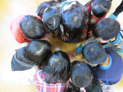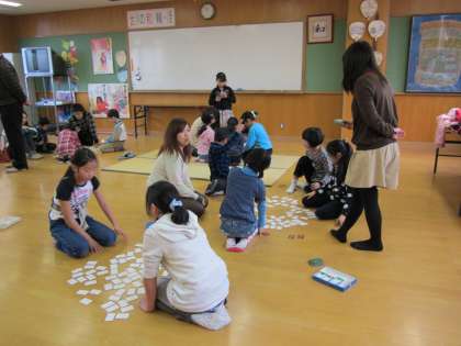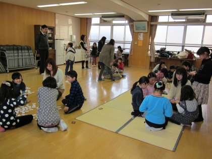 サタデースクール「かるたを楽しもう」では、後半、大変もりあがりました。みんなで5つのグループに分かれて、大学生のお兄さんお姉さんと一緒に楽しみました。