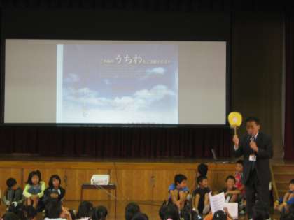 第5学年の子どもたちは,総合「風と人間,風と地球」の学習を通して,マラリア感染地域の一つであるソロモン諸島に,「うちわを送ろう」という運動を行おうとしていることを朝会の終了後に,みんなに伝えました。