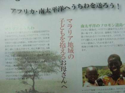 「マラリアに感染している人数は,全世界で,約3〜5億人で,年間150〜270万人もの死者が出ています。死亡年齢では,5歳以下の幼い子どもが80%を占めています。また,感染地域は,1番がアフリカで,その次が南太平洋です」という事実を子どもたちは知り,地域へ呼びかけて,「うちわ」を寄付していただく運動をこれからはじめるそうです。この運動で,一人でも,マラリア感染症から救うことを願って!