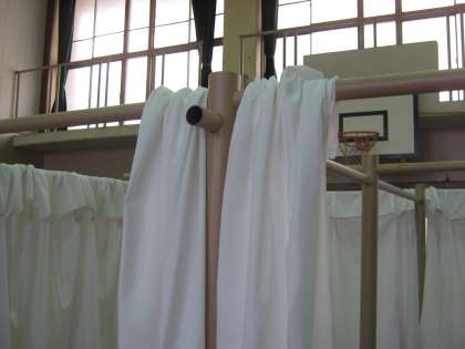 東日本大震災の時に実際に利用されたと同じ形の,紙の筒を柱にした避難所を,本校の体育館にも設置していただきました。実際の見てみると,機能性と設営するまでの時間の短さに驚きました。また,震災の時のVTRも流され,熱心に見入る地域の方の姿がありました。