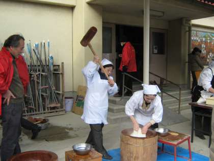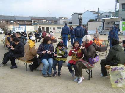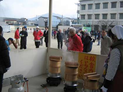 防災のつどいの一つとして「餅つき」を行っていました。地域の方が前日から用意してくださり,当日もち米をふかし,杵と臼で餅をつきました。臼でついたできたての餅は本当においしかったです。参加した皆さんも喜んで食べていました。