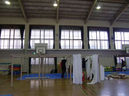 3枚目の写真は見慣れないものかと思いますが,『避難所簡易間仕切りシステム』といって,避難所でのプライバシーを確保するための間仕切りを作っているところです。