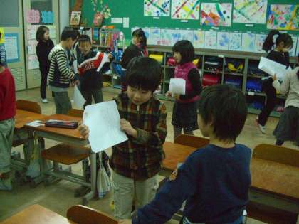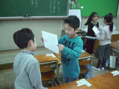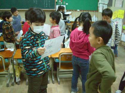 自分たちのお店を宣伝しています。国語の「おみせやさんごっこをしよう」という学習です。「おすすめは,○○です。」「ぜひきてください。」「まっています。」など,たくさんのお客さんが来てくれるようにちらしの言葉や絵も工夫しました。子どもたちが楽しみにしている「おみせやさんごっこ」は,もうすぐです。