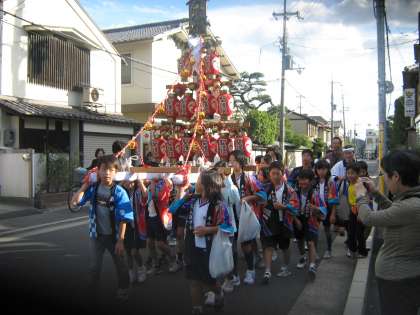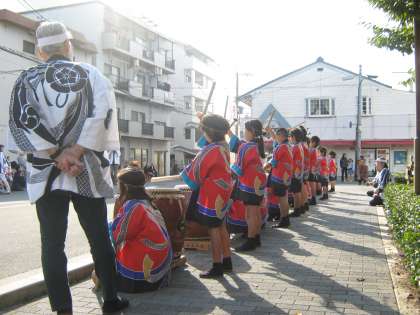 部活動 和太鼓部は,学校の前で演奏したあと,近衛のファミリーマートの前で演奏しました。そして,そのあとは,子ども神輿と一緒に今宮社まで行きました。舞台とはまた違い,沿道でのお客さんを前に,少し緊張気味の子どもたちでしたが,日頃の練習の成果を十分発揮できました。今宮太鼓の方々のご指導のおかげです。法被,はちまき,足袋と衣装も十分に揃えていただきました。本当にありがとうございました。