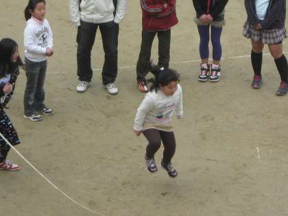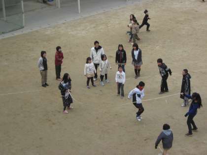昼休みに,6年生のなわとびに1年生の何人かが加わっていました。1年生が跳びやすいように,6年生の回す人がタイミングを合わせていました。