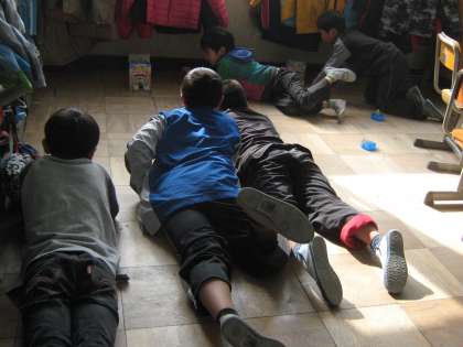 上の写真。みんななかよくごろーんと寝ころんでいる姿があまりにかわいいのでおもわずシャッターを切りました。何をしているかというと,理科の学習の「じしゃくのふしぎをしらべよう」で,じしゃくを使ったおもちゃを作って遊んでいるのです。