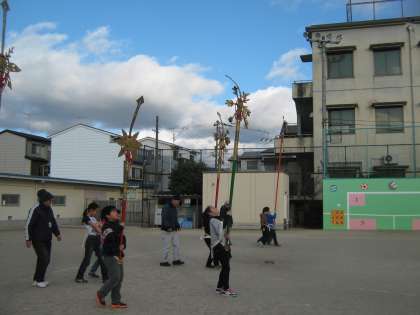 雨が上がった運動場で「剣鉾」の練習ができました。