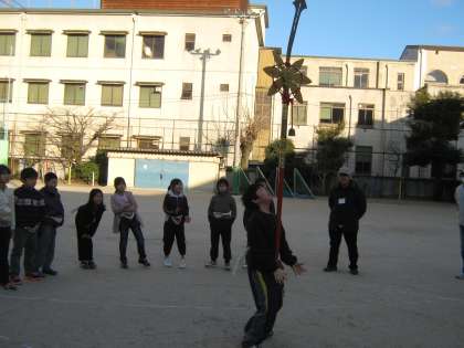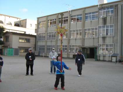 剣鉾の練習の終りに,バランス大会をしました。腰に剣鉾を差し,手を放して何秒間保持できるかを競いました。足を少し曲げて,腰でバランスをとることが長くできる秘訣です。