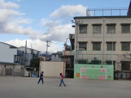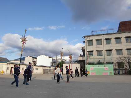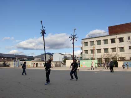 雨上がりの運動場。ギリギリ使用可能になった運動場で剣鉾部活が活動しています。水たまりを避けての稽古です。