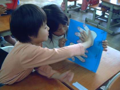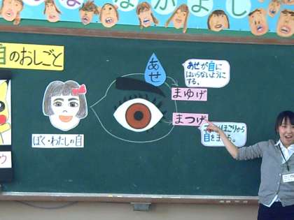 今日は,10月の保健学習を,実習生の先生と一緒にしました。10月は10月10日目の愛護デーにちなんで「目のおしごと」の学習でした。実習生の先生が子どもたちの興味を引き付けるよう工夫された教材でテンポよくお話されました。「まゆげ」「まつげ」の名称と役割をしっかり学ぶことができました。なかでもクイズで出された「らくだのまつげは10センチもある」ということが印象に残った感想が聞かれました。また,本などを読むときは目から30センチ離して読むといいことを知り,「まほうの手」という測り方をおしえていただきました。みんな目を大切にしてほしいですね。