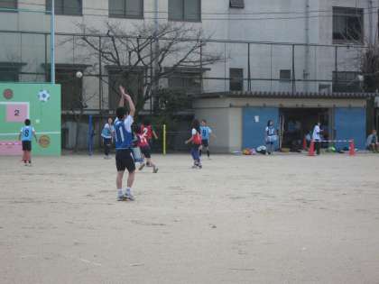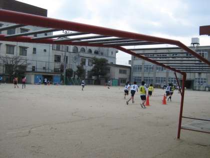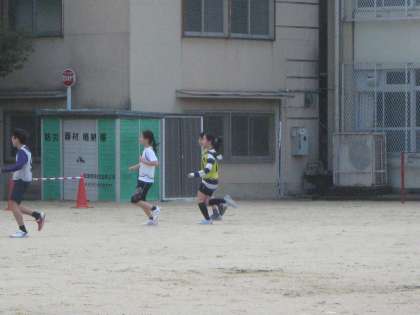 6年2組の体育は,6チームがあって3つのコートが基本ですが,どのゴールにシュートしてもいいルールで,目いっぱい動いています。前半戦と後半戦の間に作戦タイムを取ると,その作戦を活かして,チームプレーが活きていました。
