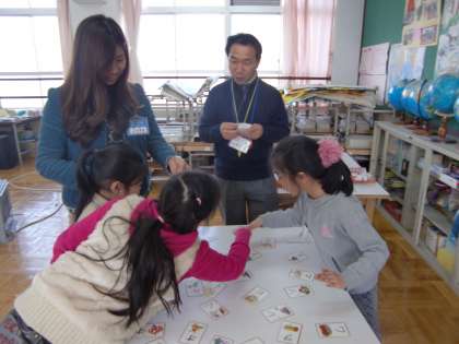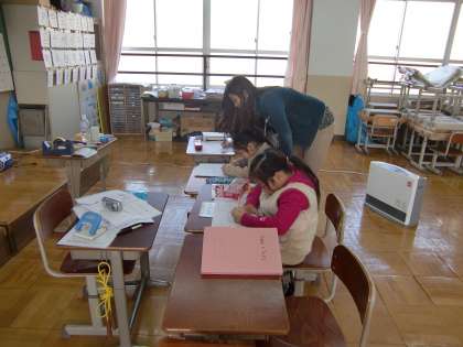 フィリピンから来た子が頑張る日本語教室の様子です。第2校時は2年生2人と3年生1人の3人が学習しています。